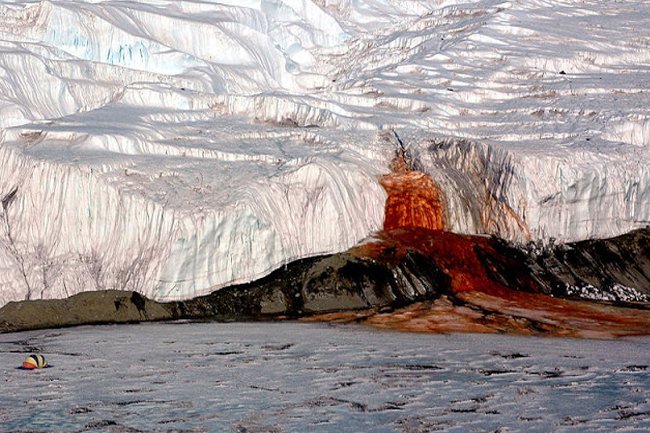 En un principio los especialistas creían que se trataba de una especie de alga roja que crecía sobre los glaciares. Con el tiempo descubrieron que en realidad la tonalidad rojiza que adquiere la caída del agua en ese tramo se debe a la presencia de óxidos de hierro.