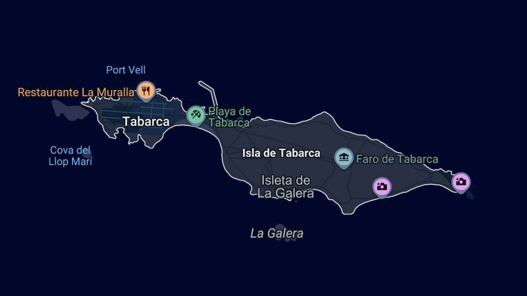 Tabarca forma parte de un pequeño archipiélago compuesto por los islotes de La Canea, La Galera y La Nao, que rodean la isla principal. La playa central que une las dos mitades de la isla está galardonada con Bandera Azul y dispone de servicios como sombrillas y hamacas. A pesar de ello, la auténtica esencia de Tabarca se encuentra en las pequeñas calas y acantilados que dibujan sus más de cinco kilómetros de perímetro.