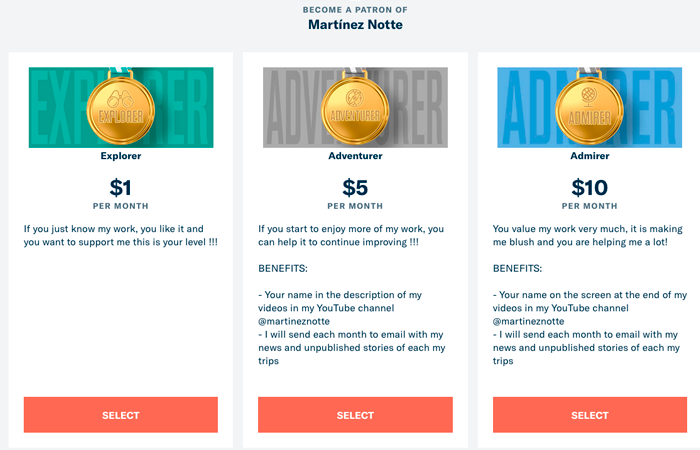En segundo término la categoría AVENTURERO, donde ya conociendo mi trabajo puedes ayudarme a seguir mejorándolo. Obtendrás por tu contribución de cinco dólares mensuales una mención en la descripción de cada nuevo video de mi canal de YouTube y un correo electrónico cada mes con noticias exclusivas de mis viajes y mis experiencias que no publicaré en ningún otro sitio y llegará directamente a tu email.